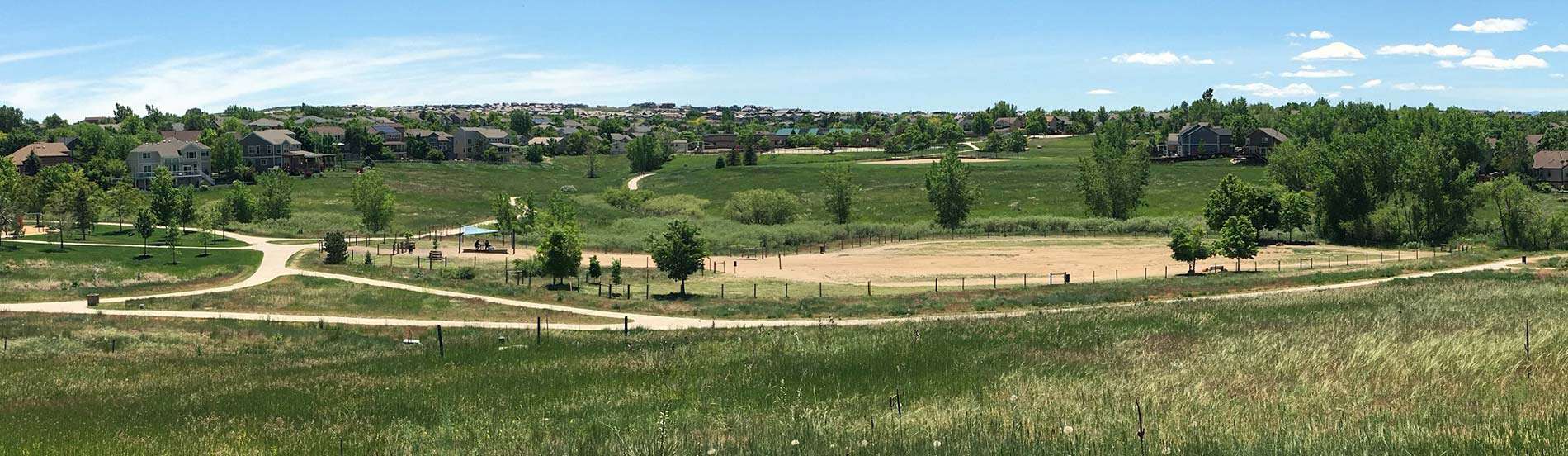 Fido's Field at Foothills Park is located in Foothills Park which is tucked in a Highlands Ranch neighborhood. You can get to it by car or foot. If you drive, there's is a parking lot off of Riddelwood Road. From there you'll walk down the path to get to the dog park. If you walk on foot, the paths come in from all directions. View the map of the park.