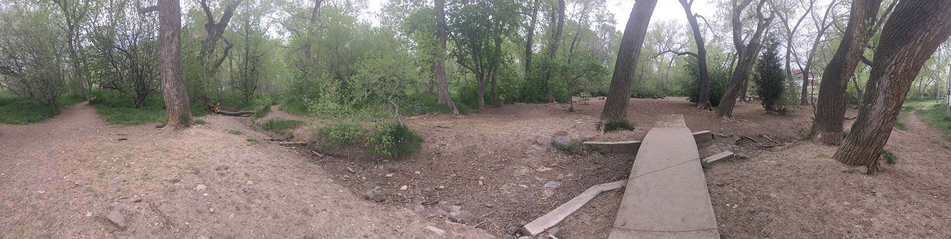Park Notes: Tony Grampsas Dog Park is an Off leash park in Golden, CO. There is only one area for dogs of all sizes to play. It's not a huge park, but it has trails that wind through the park for the humans to get some exercise. It's full of trees so it's pretty easy to find shade no matter what time of day. Depending on the time of year, there's a little stream of water the dogs can play in. You'll pass by some bathrooms (without plumbing) on your way to the park (west of the playground). You're also within walking distance to the New Terrain Brewery (east of the dog park). They have a large outdoor patio area that is dog friendly (on-leash). You can walk to New Terrain. For more info click here.